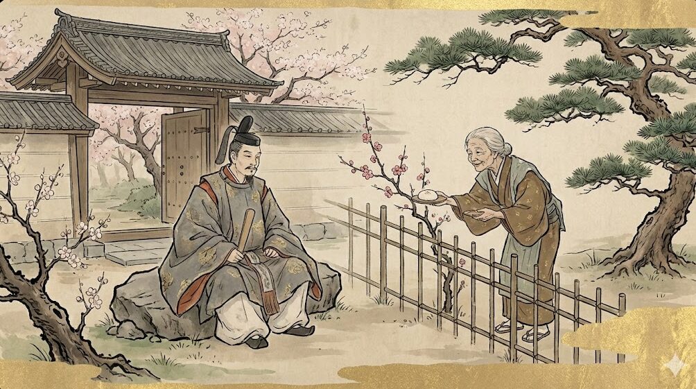 梅ヶ枝餅がなぜこれほどまでに太宰府の人々に大切にされているのか。その理由は、平安時代まで遡る「優しさの物語」にあります。学問の神様として知られる菅原道真公ですが、その晩年は、政争に敗れて太宰府へ左遷されるという、非常に過酷なものでした。罪人のような扱いを受け、食事も満足に与えられず、心身ともに衰弱していた道真公を救ったのが、近くに住んでいた浄明尼(じょうみょうに)という老婆でした。
