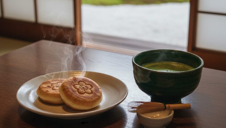 かさの家の店内で提供される梅ヶ枝餅と抹茶のセット