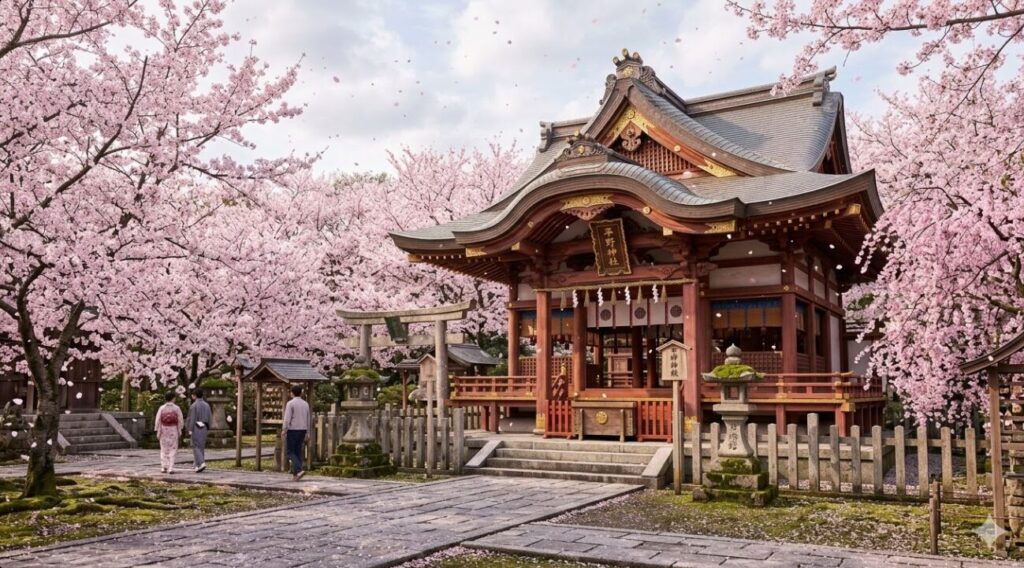 忘れてはならないのが、拝殿と桜の構図です。再建された美しい木造の拝殿は、周囲の桜と溶け合うように設計されており、どの角度からシャッターを切っても絵になります。特におすすめなのは、少し離れた位置から鳥居、拝殿、そして桜を一つの画面に収めるアングルです。