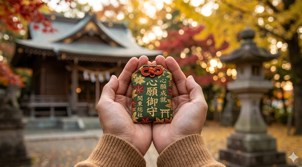 関東の神社で願いが叶うお守りを持つ手