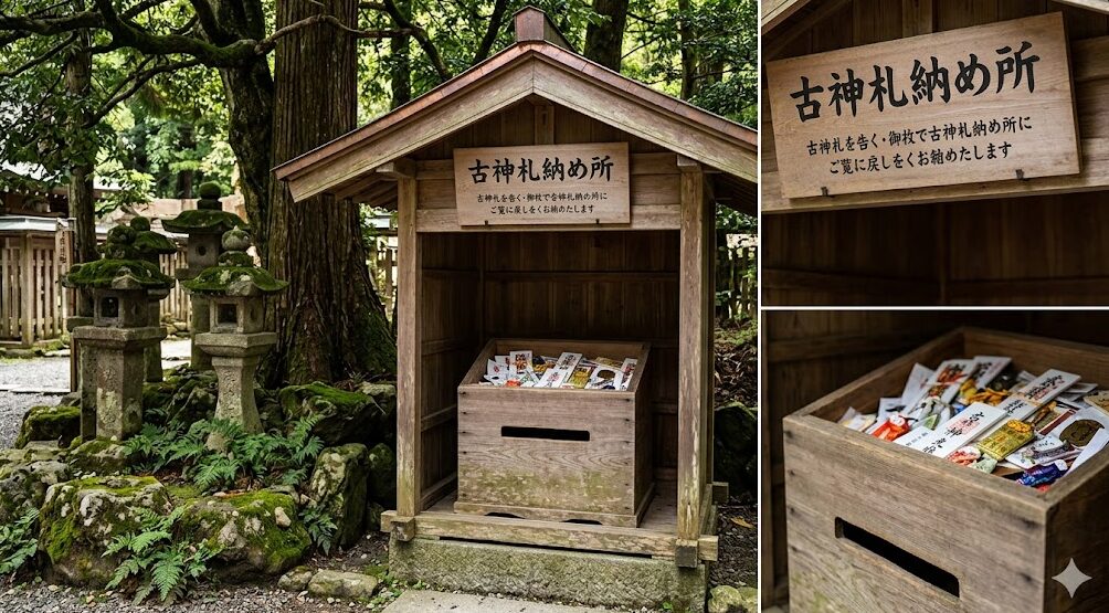 - 古札納所(こさつおさめじょ)を利用する: 年末年始に限らず、多くの神社仏閣の境内には、古いお札やお守りを返すための専用の場所(箱)が常設されています。「古札納所」「お焚き上げ受付」といった看板が出ていますので、そこへお守りをそっと納めます。