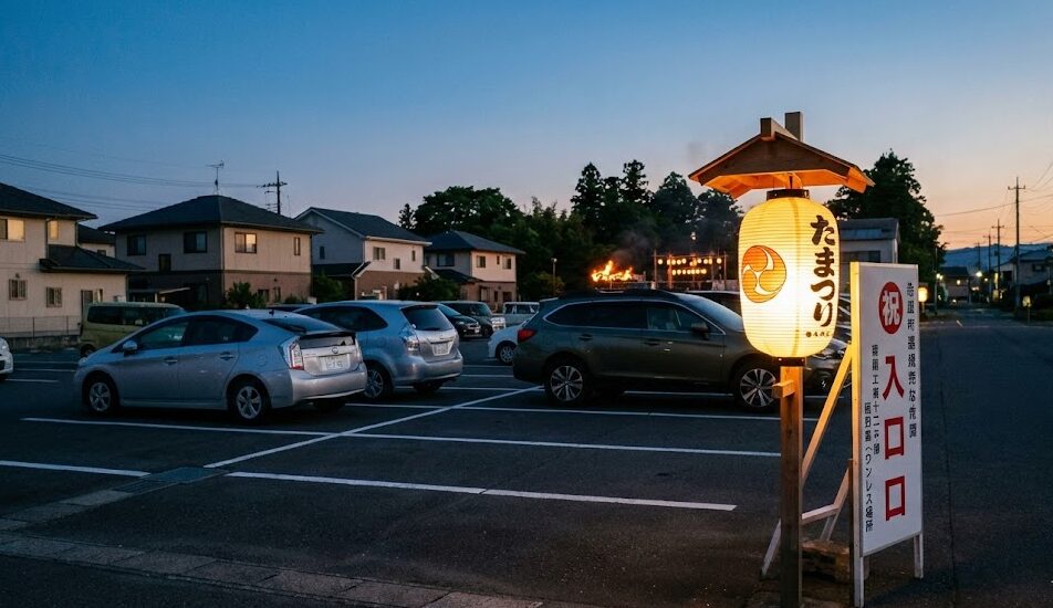 遠方からお越しの方で、どうしても車で近くまで行きたい場合は、午前中、遅くとも14時までには現地入りし、後述する予約制駐車場を確保しておくのが「勝利の方程式」です。夕方以降に車で近づくのは、火の中に飛び込むようなもの(祭りだけに)だと心得てください。