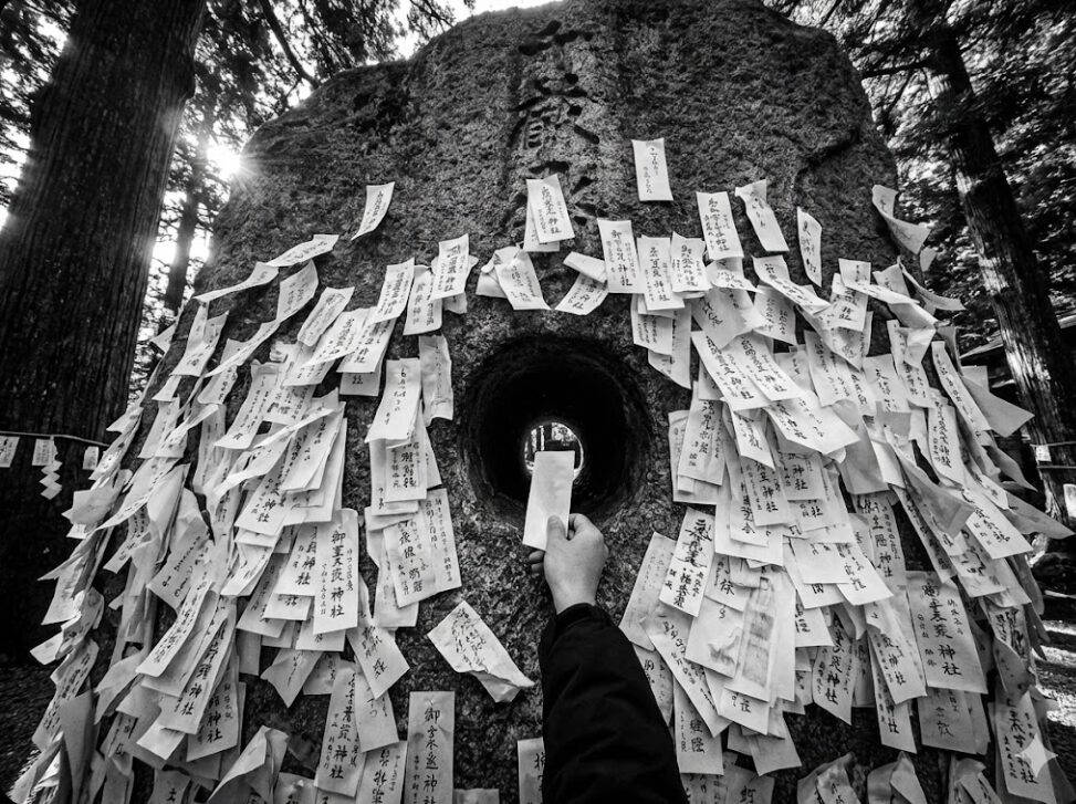 境内にどんと構える、お札がびっしりと貼られた巨大な石。「縁切り縁結び碑(いし)」と呼ばれるその姿は、異様とも言える迫力があります。参拝方法は独特で、まず形代(かたしろ)という紙に切りたい縁と結びたい縁を書きます。そして、そのお札を持って石の穴を「表から裏へ」くぐって悪縁を切り、次に「裏から表へ」くぐって良縁を結ぶ。