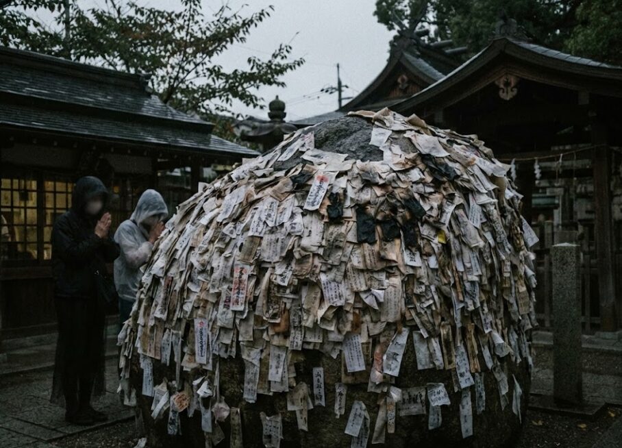 安井金比羅宮の境内に入り、まず目に飛び込んでくるのは、数えきれないほどの「形代(かたしろ)」に覆われた「縁切り縁結び碑」です。その異様な姿は、一見すると何かの呪術のようにも見え、初めて訪れる人を圧倒します。この碑には、安井金比羅宮で助けてと、誰にも言えない苦しみを吐露するような願いがぎっしりと貼られています。人々の執念が物理的な重みとなって積み重なっているこの場所が、ある種の「怖さ」を醸し出すのは、いわば自然なことかもしれません。